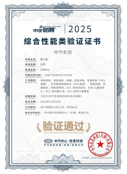 12月30日,由中汽中心组织的2025中汽冬测结果正式发布。“家庭智慧旗舰SUV”问界M8凭借在“雪地高速爆胎控制”“雪面加速”“雪面双移线”等项目中的出色表现,获得“综合性能类验证”“智能底盘安全技术验证”双证书,印证了其在极端低温环境下的卓越产品力。