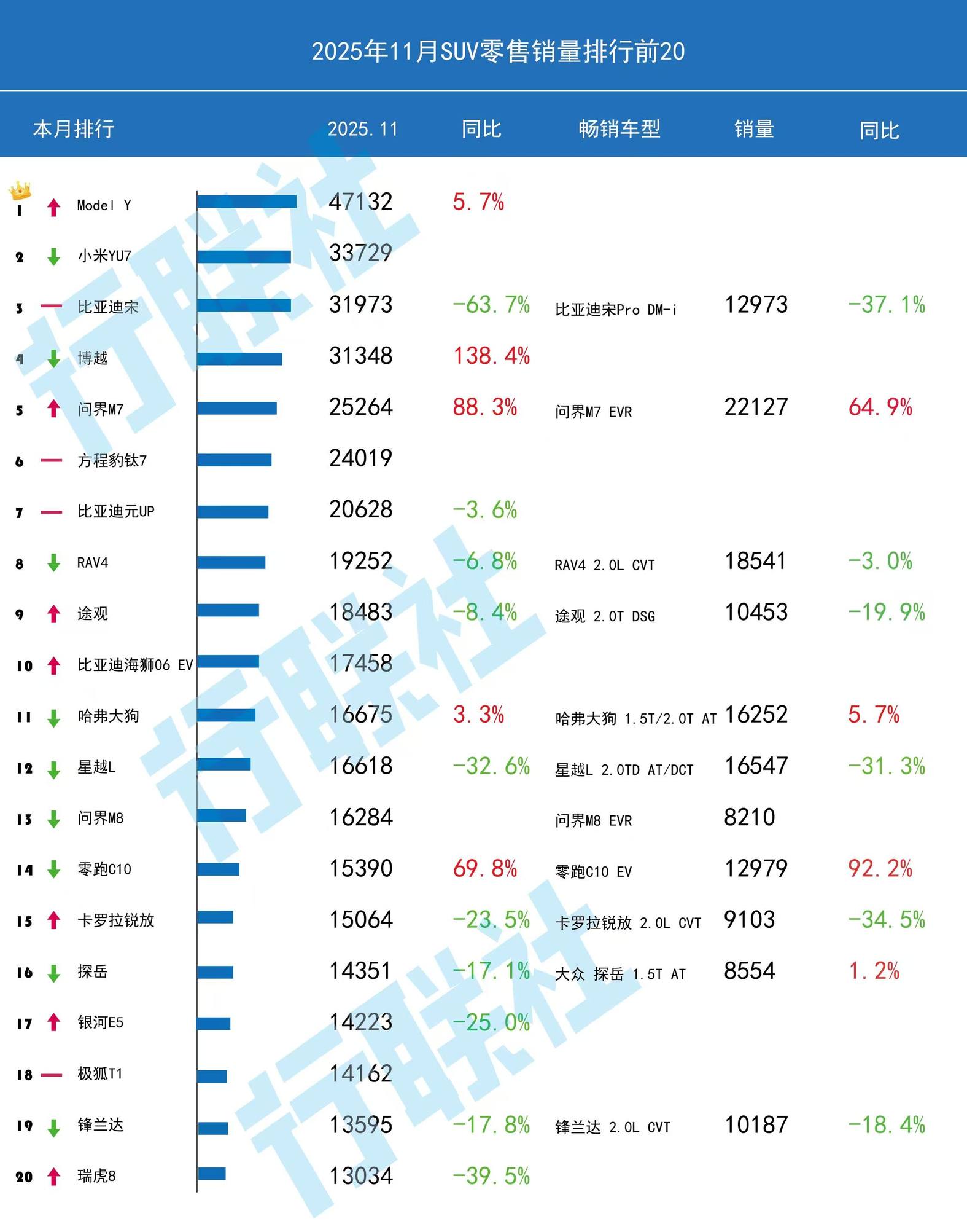 排行前20中,正增长只有5款,其中博越销量31348辆,同比增长138.4%成为燃油 SUV 销冠,靠性价比与越级配置守住基本盘。问界M7销量25264辆,同比增长88.3%。Model Y销量以47132辆,同比增长5.7%重新登顶。小米 YU7 本月销量33729辆,连续两月破 3 万,生态与智能化吸引年轻群体。