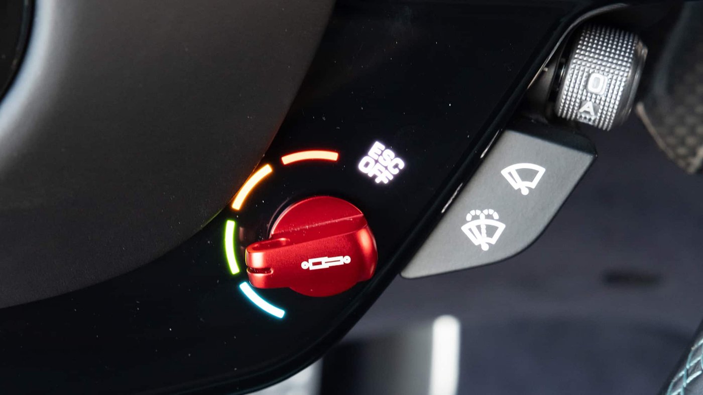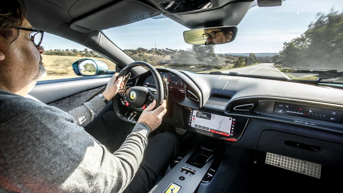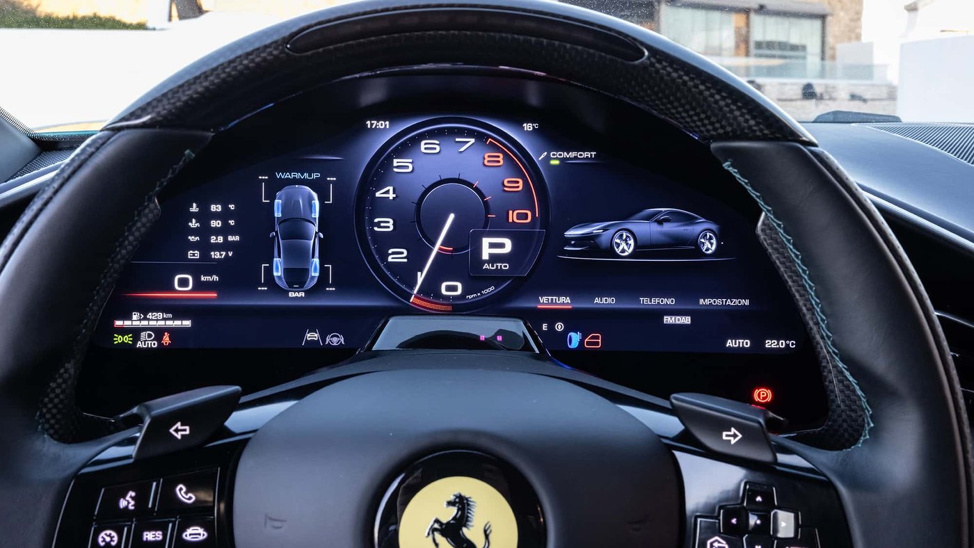 是的,这里迎接你的是一个全新的世界:方向盘上的触控按钮被真正的物理按钮取代,尤其是那个“启动”按钮,在Roma中原本被设计成位于法拉利标志下方的触控面板。现在,它显眼得不容错过,粗大而鲜红,赫然出现在左侧方向盘辐条上。“Premimi”,它似乎在对你说,意大利语意思是“按我”。