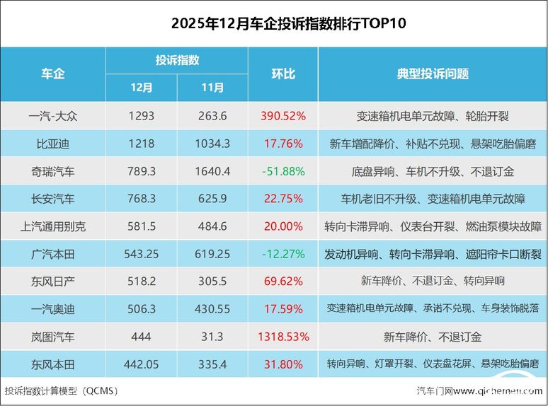 2025年12月车企投诉指数排行:多车企投诉大幅上升