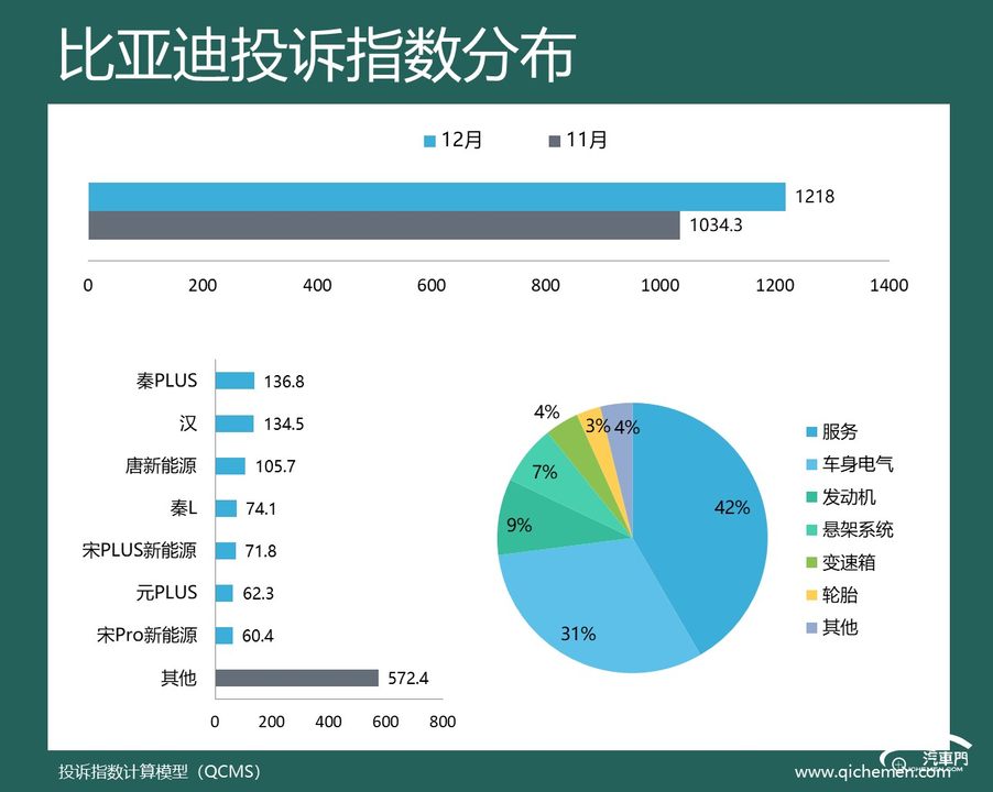 汽车质量投诉点评:本月,比亚迪依然排在第二位,但投诉指数上涨了18%。这背后,秦PLUS、汉、唐等车型投诉指数的上升直接推高了比亚迪的整体投诉指数。而从投诉问题来看,比亚迪12月份依然未出现新问题,投诉点仍围绕新车降价、悬架吃胎偏磨等问题展开,而且投诉集中度也较低。