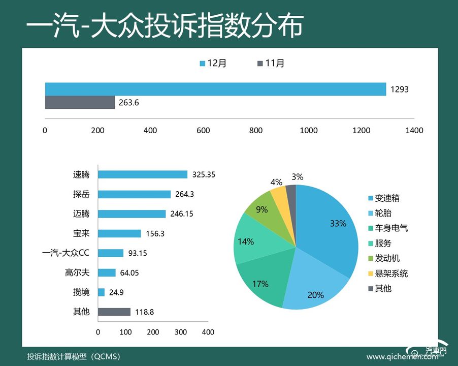 汽车质量投诉点评:2025年最后一个月,“久未谋面”的一汽-大众投诉指数突然暴涨,进而冲到了投诉榜首。不过,将一汽-大众推向榜首的投诉问题倒在意料之中。从投诉反馈来看,变速箱机电单元故障成了一汽-大众的重点投诉对象。值得一提的是,一汽-大众的双离合变速箱问题由来已久,迈腾、速腾、CC、探越等多款车型都有大量案例。当然,问题车型多发于2017款-2021款,近三年内的新车问题较少。另外,宝来和速腾的轮胎开裂问题本月同样遭到了众多车主的投诉。有车主称,新轮胎三个月就出现开裂问题,但目前还没有解决方案。