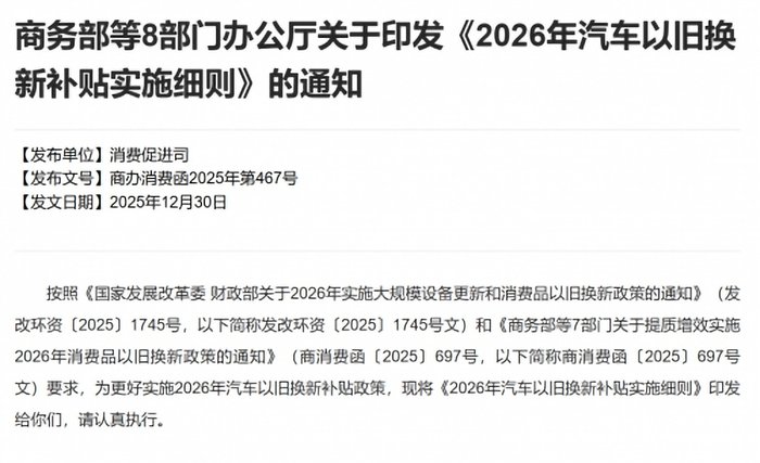 踏入2026年,迎接我们的不止元旦假期,更有2026年汽车以旧换新补贴开始实施的好消息。在新政中,以往的定额补贴调整为按车价比例进行补贴,通过汽车报废或置换更新,最高可补贴2万元。