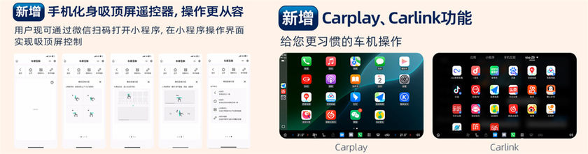 智能互联方面,手机可遥控二排吸顶屏,操作更便捷;Carplay和Carlink功能也同步上线,微信定位一键发送到车,地图可随心增加途经点,便于途中探访亲友或顺路购物,出行规划更显灵活。