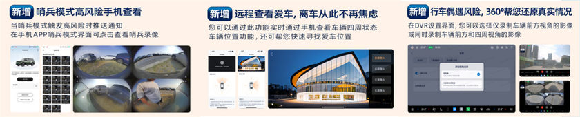 智能车控全面升级,车主可随时随地了解爱车情况,哨兵模式可手机查看高风险视频、新增远程车辆监控,通过手机APP远程查看车外图片和视频,保障车辆安全;新增行车记录仪五视角功能,全视角记录行车风险,及时录制影像还原真实情况;