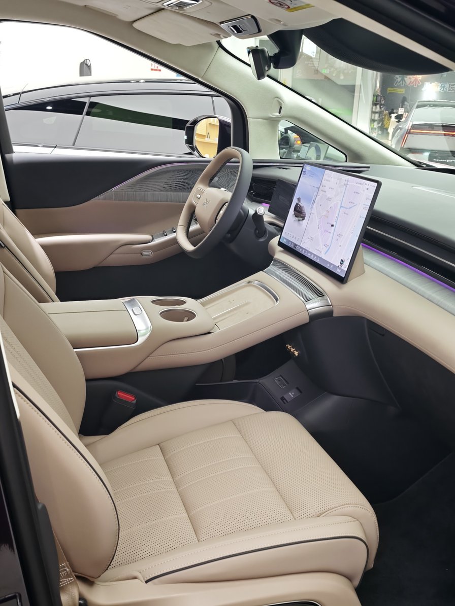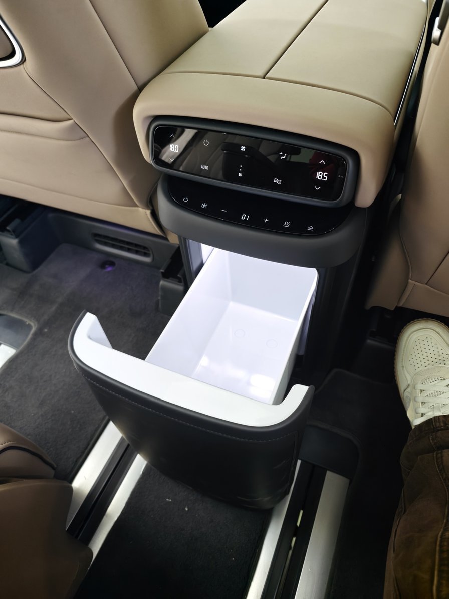 后排的空调出风形式很人性化,是柔风,避免了直吹,顶棚还配备了头等舱样式的可调阅读灯,阻尼感也不错,使用体验很好。后排屏收折时依旧是屏幕那面朝外,这让我总是担心屏幕的安危;冰箱做到了完全的电动开关,并可以用语音控制,这方面体验倒是做到了十足的高级。甚至,X9增程版还在车顶保留了眼镜盒,这对夏天必备墨镜的我来说是个惊喜。