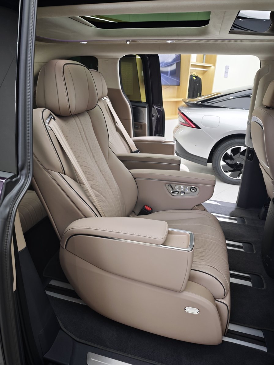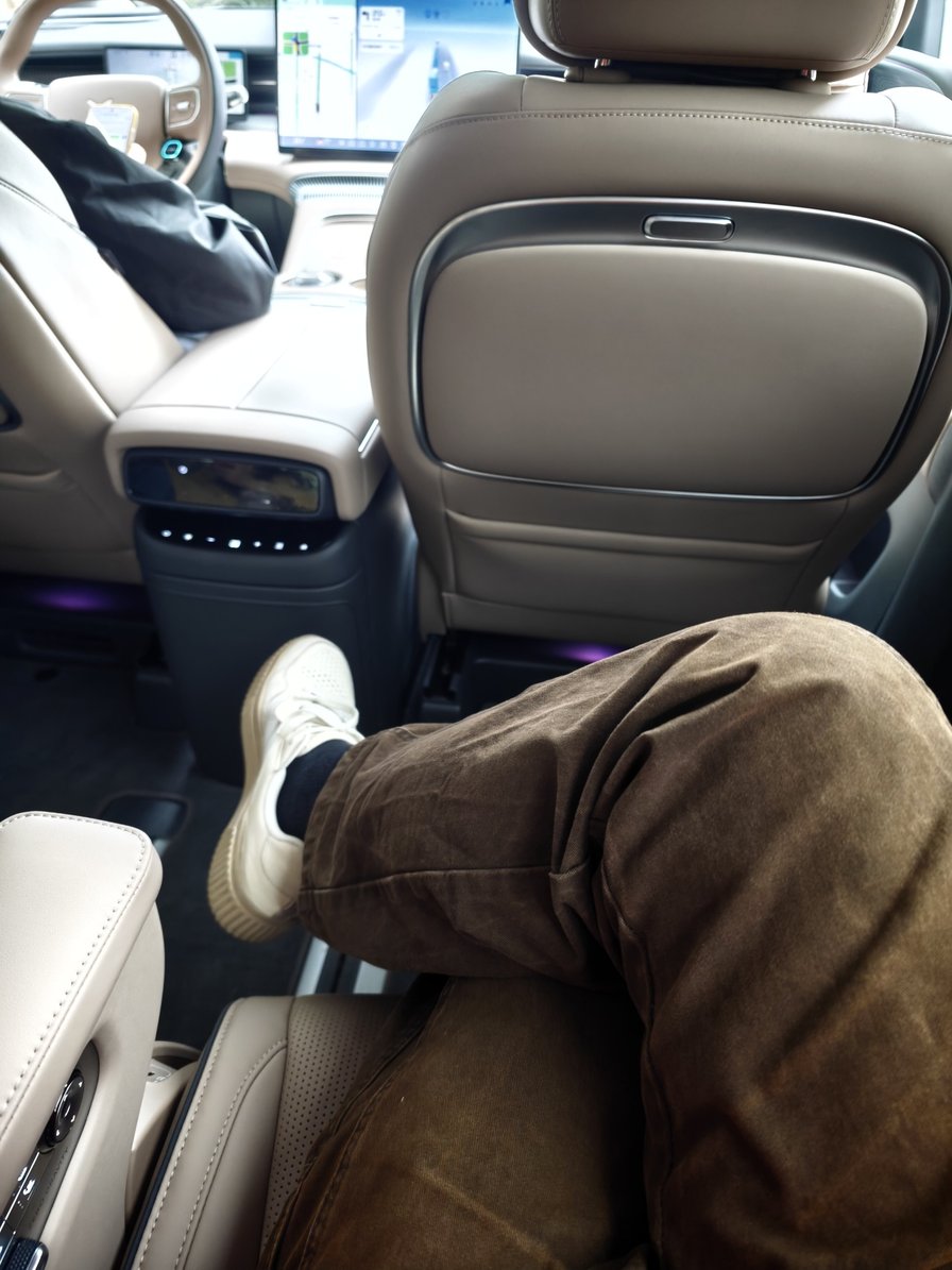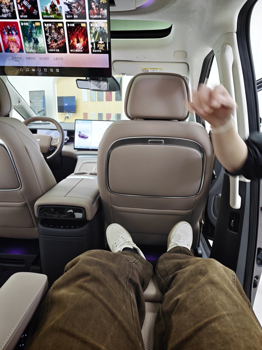 二排座椅舒适性也非常棒,宽敞舒适,可调角度巨大,零重力座椅调节幅度合理,功能丰富,有使用便捷的实体按键且操作质感也不错,甚至还留出了中央过道。除了头枕位置较高对小个子成员不够友好外,几乎找不到什么问题,半躺着在车里开启座椅按摩和柔风空调,真的可以很快睡着。
