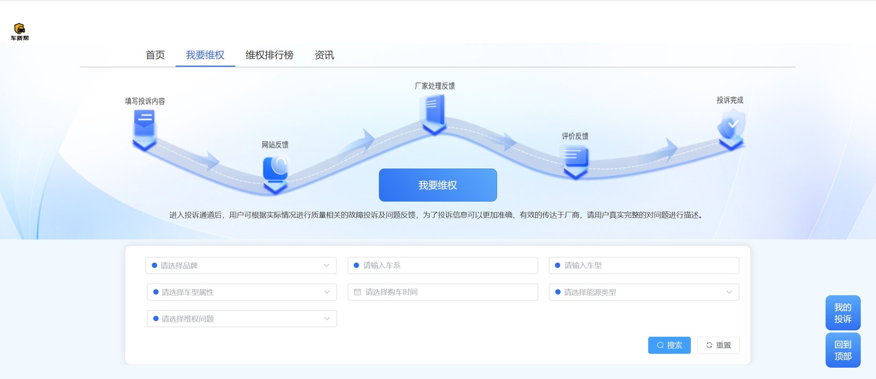 以往车主遭遇车辆续航虚标、车身异响、车漆爆皮、天窗漏水等问题时,常面临厂家与 4S 店相互推诿的困境。车质帮简化维权流程,让维权变得简单高效:车主只需通过微信搜索 “车质帮” 小程序,或登录官网,详细描述问题并上传相关照片、视频作为证据,提交后即可完成诉求登记。