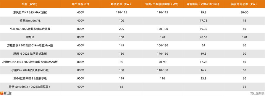 10款车型的补能测试多数使用蔚来的500kW超充桩,理想i8和东风日产N7 625 MAX顶配版用的是160kW快充桩,特斯拉Model 3则使用常见的120kW充电桩。
