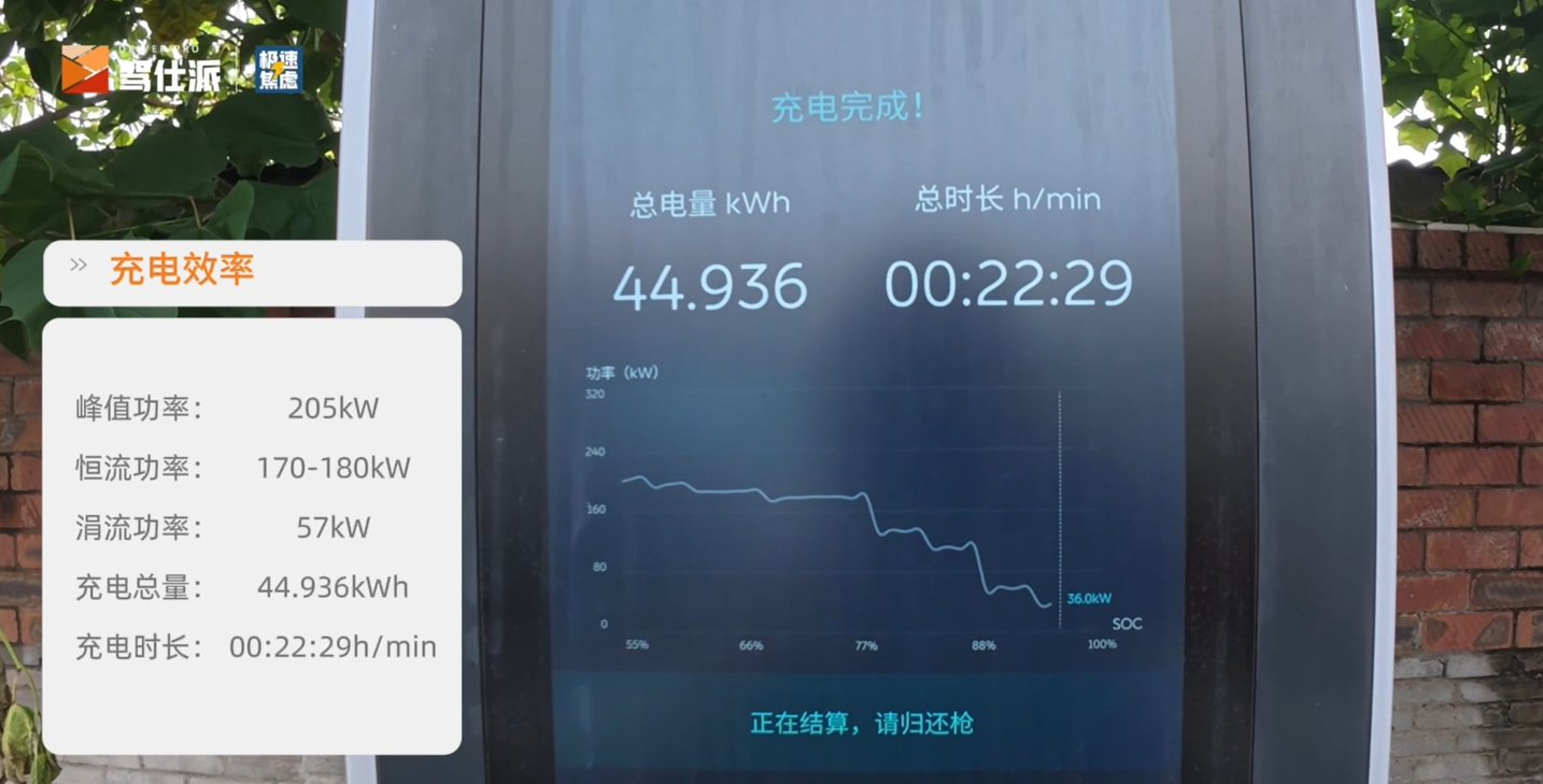东风日产N7 625 MAX顶配同样基于400V平台,在160kW快充桩上补能,峰值功率约110–115kW,电量充到80%后功率下降到30–50kW。从46%充至95%仍只用了33分钟,充入43.5kWh电量,网端电耗19.2kWh/100km。整体表现虽谈不上亮眼,但放在同级里也算及格成绩。