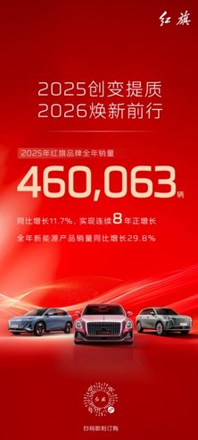 新华AUTO:红耀九州,旗领新篇。2026年1月1日,红旗品牌发布最新销量成绩:2025年红旗品牌全年销量突破46万辆,同比增长11.7%,实现连续8年正增长,持续巩固自主豪华品牌领跑地位。其中,红旗新能源产品全年累计销量14.9万辆,同比增长29.8%,持续担当销量增长核心动能。红旗金葵花产品销量1,404辆,持续在超豪华市场打造具有东方神韵的顶级豪华体验。
