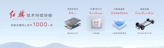 自2023年全面、全方位、全体系向智能网联新能源汽车转型以来,红旗品牌紧紧围绕国家所需、产业所急、用户所想聚力攻坚,突破关键核心技术1000余项。其中,已经完成了66Ah全固态电芯的试制及验证,主要指标达到国际领先水平;推出了中国首颗车规级、5纳米五域融合芯片“红旗1号”;研发了拥有完全自主知识产权的全主动智能底盘,真正做到转弯零侧倾、制动零俯仰、冲击零颠簸。通过一系列技术的创新应用,红旗品牌打造了“天工”纯电、“鸿鹄”混动、“九章”智能三大技术平台,为红旗品牌的持续跃迁打牢了坚实技术底座。