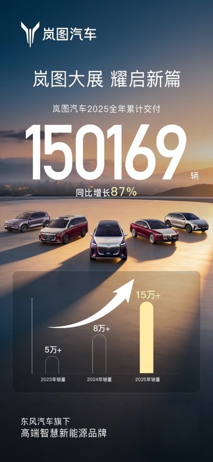 凭借“产品领先”“技术领先”与“市场领先”的多轮驱动,岚图汽车在2025年实现全面跃升。迈入“十五五”,岚图将在品牌、产品、技术、服务、渠道及出海等多维度持续进阶,带动品牌实现新一轮跨越式发展,通过高质量增长,为中国新能源汽车产业发展贡献更强动力。