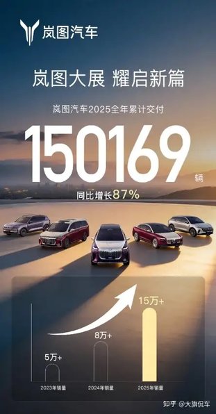 2026年1月1日 岚图汽车发布2025年交付数据。2025年,岚图全年累计交付150169辆,同比增长87%,连年攀升,展现强劲发展势头。作为央国企新能源转型的主力军,岚图汽车以技术创新为根,不断完善产品矩阵,夯实“央国企高端新能源第一品牌”领先位置。随着赴港上市稳步推进,岚图的品牌价值、技术实力与发展前景亦获资本市场高度认可。