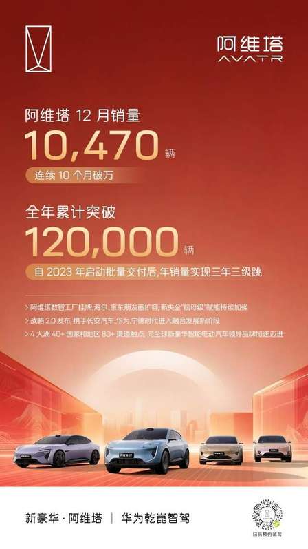 阿维塔2025年销量超12万辆,连续10个月破万,站上发展新台阶