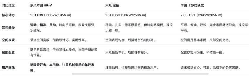 对比15-20万级合资燃油SUV竞品,东风本田HR-V的优势依然显著。与丰田C-HR相比,HR-V的1.5T动力参数全面领先,空间利用率更高,5门5座布局也比C-HR的两门设计更实用。