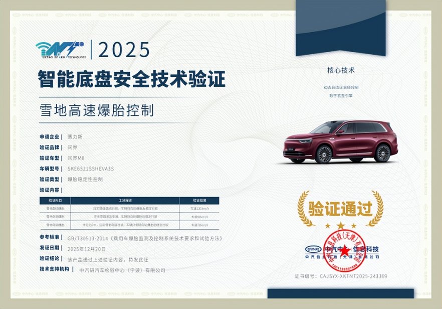 12月30日,由中汽中心组织的2025中汽冬测结果正式发布。“家庭智慧旗舰SUV”问界M8凭借在“雪地高速爆胎控制”“雪面加速”“雪面双移线”等项目中的出色表现,获得“综合性能类验证”“智能底盘安全技术验证”双证书,印证了其在极端低温环境下的卓越产品力。