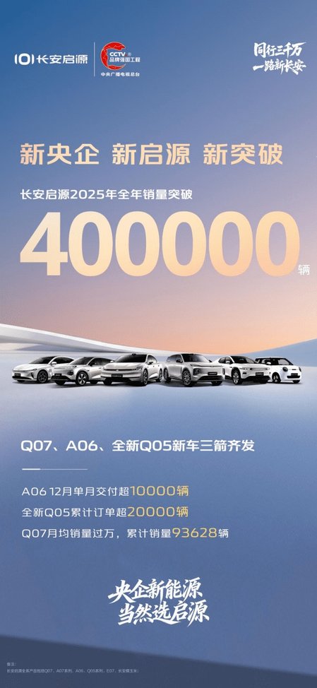 在刚刚过去的2025年,长安启源率先交出一份亮眼的成绩单,全年销量突破40万辆,尽显强劲市场竞争力。明星车型长安启源A06在12月份交付破万,长安启源全新Q05累计订单超2万,长安启源Q07上市8个月累计实现销量超9.3万,月均销量过万,领跑新能源中型SUV细分市场,稳坐央企新能源中型SUV销量冠军,成为万千家庭向美好生活跃迁的价值之选。