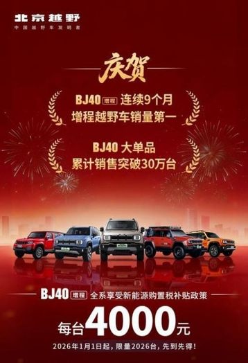 日前,国家发改委、财政部等多部门联合印发《关于2026年实施大规模设备更新和消费品以旧换新政策的通知》,明确自2026年1月1日起,对换购新能源乘用车的用户,按新车销售价格8%给予补贴,最高额度达1.5万元。在此政策背景下,北京越野迅速响应,于新年第一天正式启动“国补延续 BJ加码”专项活动,通过“国家补贴+企业补贴”双重让利,进一步降低用户购车门槛。