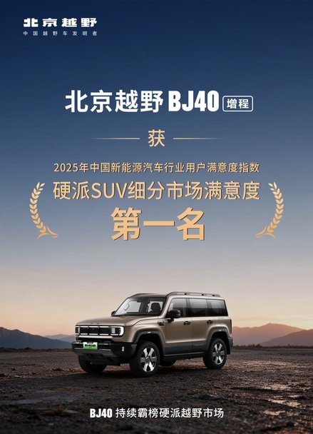 2025年,北京越野全年销量突破14万辆,其中BJ40增程贡献显著。在中国质量协会发布的2025年NEV-CACSI测评中,BJ40增程荣获硬派SUV细分市场用户满意度第一,北京越野品牌也获评“市场质量信用AAA企业”,品质实力获权威认可。