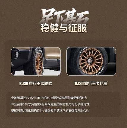 BJ30旅行王者套件搭载245/60R18规格轮胎,兼顾公路行驶的舒适性与越野场景的抓地性能,助力用户实现全地形场景掌控;搭配18寸负值轮毂,不仅赋予车辆更强的视觉冲击力,更通过强化结构设计,确保在复杂路况下具备出色的高强度与耐久性,进一步提升行驶稳定性。