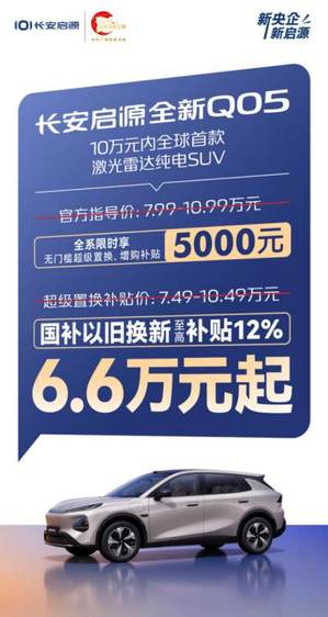 国补已就位,时机不等人!10万元内全球首款激光雷达纯电SUV——长安启源全新Q05,助你一站式锁定政策红利。新年焕车,抢档福利,即刻冲刺,轻松焕新!