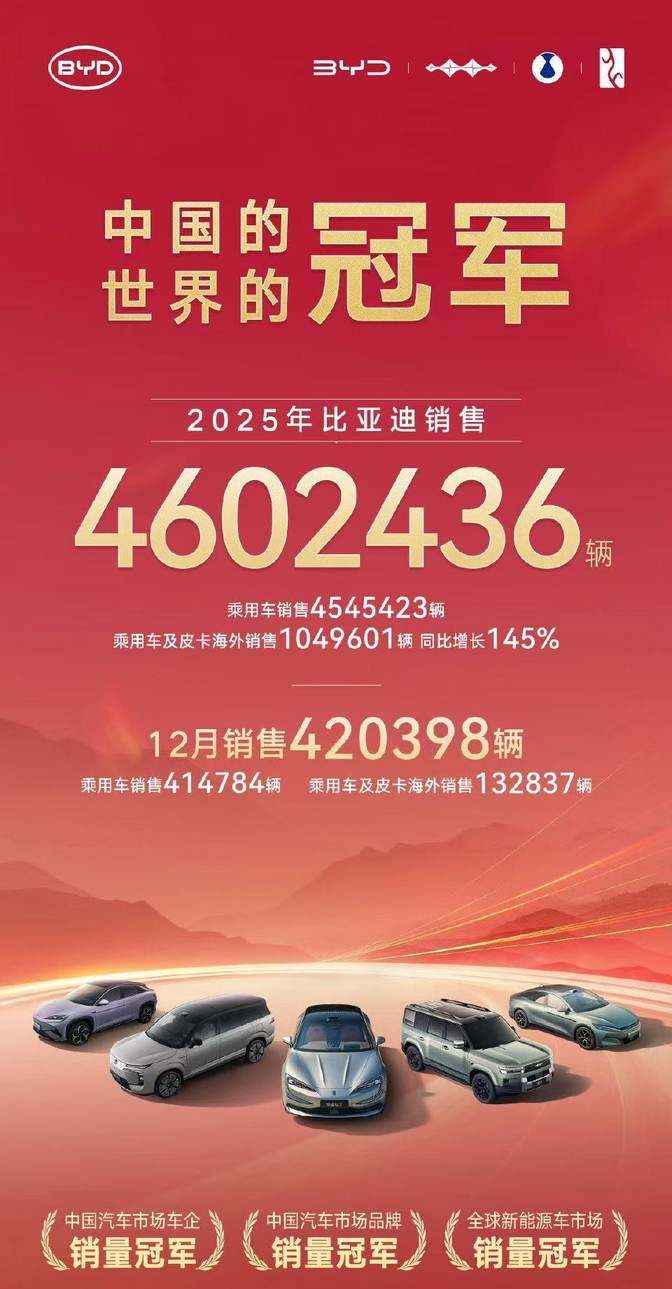 2025年终盘点之比亚迪:卫冕全球销冠+纯电首超特斯拉!