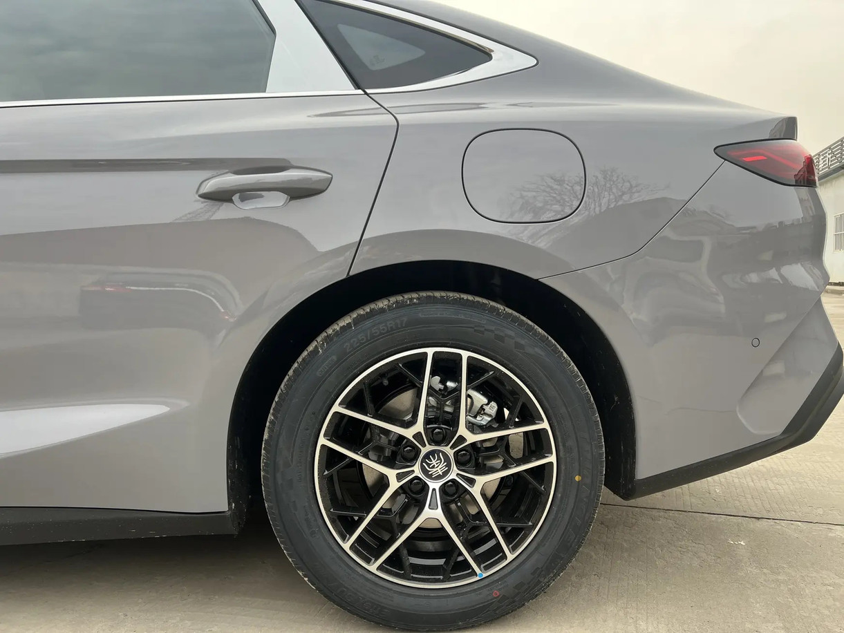 车身侧面也继续采用溜背式造型,不过车窗四周将加入镀铬饰条点缀,并换装了全新17英寸双五辐式双色轮毂,再配合“未央灰”配色,看起来更有质感。