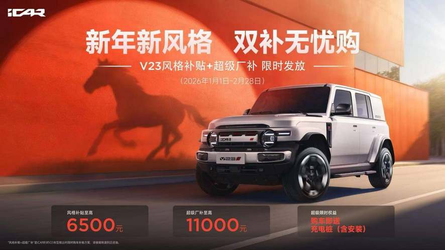 具体来看,即日起至2月28日期间,购买超级V23车型的用户,可享受至高6500元的“风格补贴”以及至高1.1万元的“超级厂补”,除此之外,用户还可叠加获赠免费充电桩及安装服务,从购车到用车一步到位,彻底打消后续用车顾虑。三重福利无套路叠加,总补贴力度至高可达1.75万元,让每一位热爱方盒子的玩家,都能无负担地开启属于自己的个性出行生活。