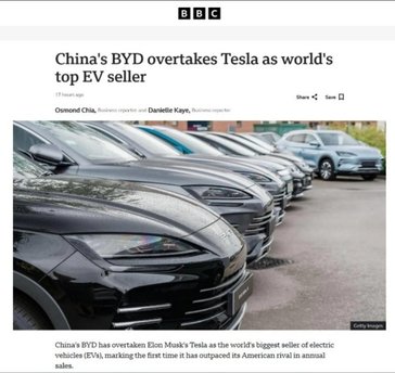 英国媒体BBC报道:中国比亚迪超越特斯拉成为电动汽车销冠