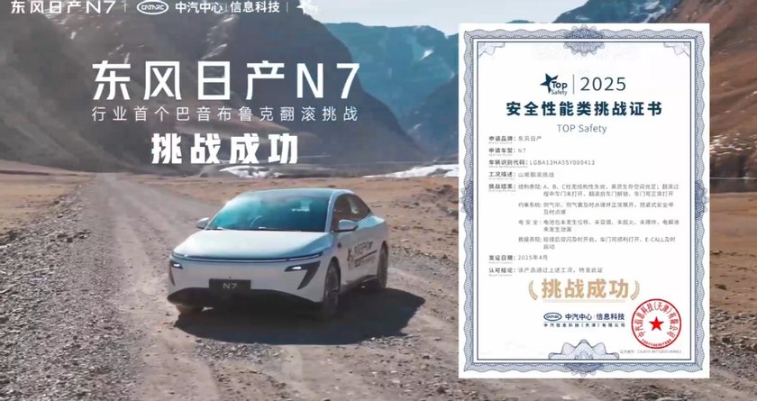 作为东风日产天演架构的首款车型,在安全和续航这块,东风日产N7也拿出了合资品牌的硬核实力。它的电池系统经过了146项超高标准安全测试,其中就包括行业首创的四针刺多电芯整包无热蔓延实验,静置72小时都没起火、没爆炸;车身用了五横十纵的笼式骨架,搭配2000MPa的超高强A柱等硬核车身材料,成为行业首个通过中汽中心TOP Safety巴音布鲁克翻滚挑战的车型。