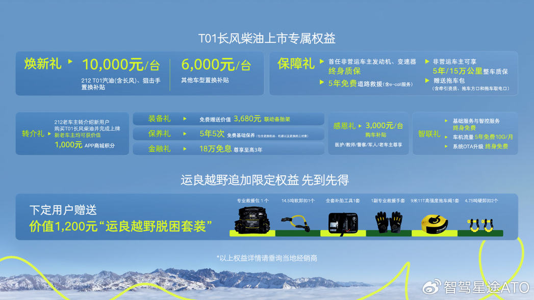 为提升用户全周期的越野用车体验,T01长风柴油推出了丰厚的上市权益:包括至高3年18万免息金融政策,5年5次免费基础保养,5年免费道路救援,以及联动备胎架及拖车包免费赠送;T01汽油版及狙击手老车主可享10000元置换补贴,其它车型可享置换补贴6000元;首任非营运车主可享发动机变速箱终身质保,非营运车主可享5年/15万公里整车质保;T01老车主介绍新用户购车,双方均可获得价值千元积分;军人、教师等特定群体额外享受3000元专属补贴。212越野车以实实在在的诚意,守护每一位用户向往远方的初心。