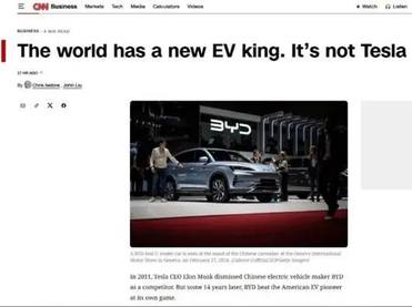 美国媒体CNN报道:世界迎来新的电动汽车王者,并非特斯拉