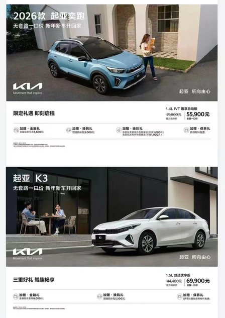 韩系品牌方面,起亚针对旗下起亚K3和2026款起亚奕跑推出一口价活动,前者一口价为6.99万元,后者一口价为5.59万元,并且推出了一系列的金融购车政策。