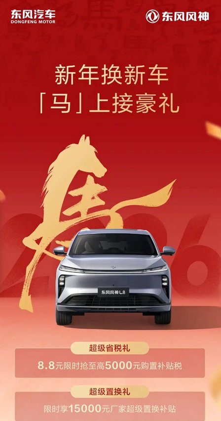 奇瑞品牌方面,推出了“国补厂补同时补,购奇瑞过大年”限时优惠活动,针对旗下燃油、新能源全系重点车型均享超值补贴,至高可达20000元。至于东风集团,旗下风神L8也推出了限时优惠活动,可享受8.8元限时抢至高5000元购置税补贴税以及限时享15000元厂家超级置换补贴。