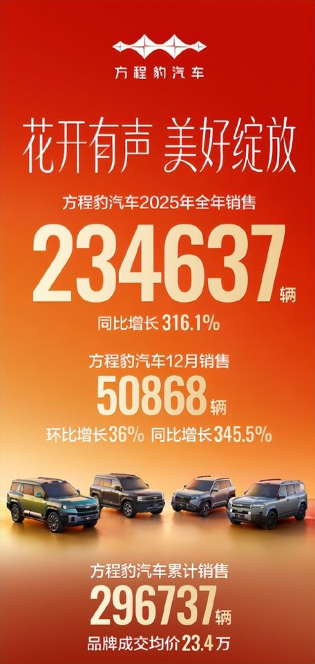 先上干货:全年卖了234637辆,同比暴涨316.1%;光是12月一个月就买了50868辆,环比涨36%、同比更是飙到345.5%;品牌累计销量已经到了296737辆,更狠的是23.4万的品牌成交均价,这证明了方程豹不是靠低价走量的“薄利多销”,是真把“硬派+新能源”卖出了溢价。