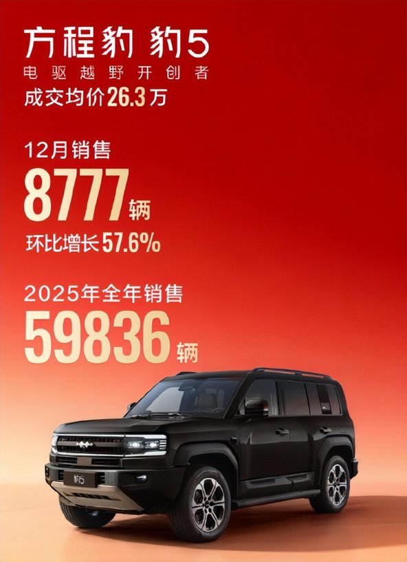 豹5(电驱越野):12月销量是8777辆、全年59836辆。以前越野圈认燃油大排量,但它用电驱解决了“动力响应慢+续航焦虑”,性能还不输燃油车——现在不少越野老炮换了豹5,这是把传统硬派的基本盘给撬了。