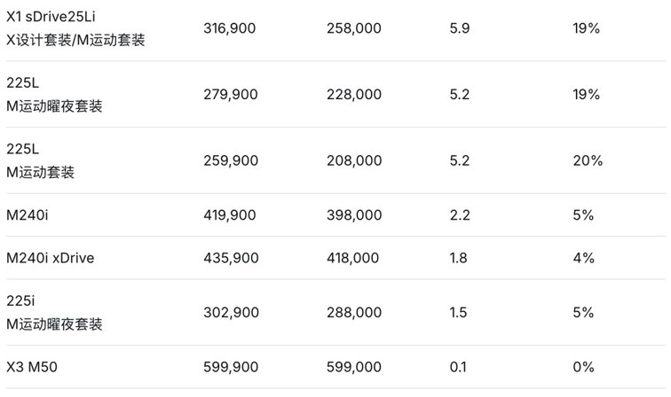 而宝马在中国市场最畅销的4款车型(3系、5系、X3和X5),并未出现在此次官降行列之中,仅有一款X3 M50车型象征性下调了900元。