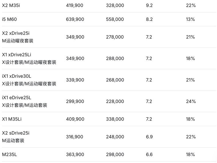 其一,此次降价涉及的车型多为市场中的冷门车型。具体来看,降价车型名单主要包括7系、i7、X7、X6、X2以及2系等系列,这些车多是旗舰车型,或是轿跑SUV、性能车,本身市场容量有限。