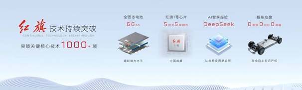 自2023年全面、全方位、全体系向智能网联新能源汽车转型以来,红旗品牌紧紧围绕国家所需、产业所急、用户所想聚力攻坚,突破关键核心技术1000余项。其中,已经完成了66Ah全固态电芯的试制及验证,主要指标达到国际领先水平;推出了中国首颗车规级、5纳米五域融合芯片“红旗1号”;研发了拥有完全自主知识产权的全主动智能底盘,真正做到转弯零侧倾、制动零俯仰、冲击零颠簸。通过一系列技术的创新应用,红旗品牌打造了“天工”纯电、“鸿鹄”混动、“九章”智能三大技术平台,为红旗品牌的持续跃迁打牢了坚实技术底座。