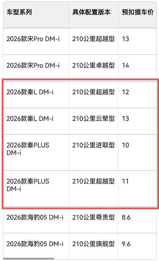 两款新车均将于1月8日正式上市,而参考经销商预扣提车价来看,26款秦PLUS DM-i长续航版或推出210公里进取型、210公里超越型两款配置,价格分别为10万、11万;26款秦L DM-i长续航版或推出210公里超越型、210公里云辇型两款配置,价格分别为12万、13万。一般来说,预扣提车价会高于实际上市价格,那么,您认为26款秦家族长续航版定价多少合适呢?欢迎留言评论。
