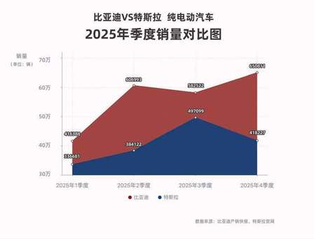 炸裂数据背后,是比亚迪的 “全面碾压”:2025 年全年新能源总销量 460.2 万辆,继续稳坐全球新能源车企头把交椅,纯电车型同比暴涨 27.86% 的增速,与特斯拉的下滑形成鲜明反差。更震撼的是,这并非偶然爆发 —— 比亚迪已连续五个季度实现纯电销量超越特斯拉,2025 年四个季度销量均持续领跑,从一季度的 65.08 万辆对 41.64 万辆,到四季度的 58.26 万辆对 33.67 万辆,每一季度都在拉大差距,用实打实的销量证明 “新王加冕” 的必然性。