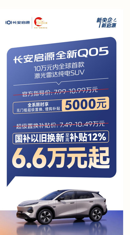 国补已就位,时机不等人!10万元内全球首款激光雷达纯电SUV——长安启源全新Q05,助你一站式锁定政策红利。新年焕车,抢档福利,即刻冲刺,轻松焕新!
