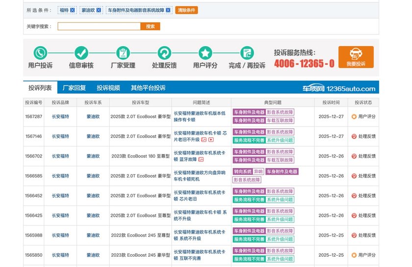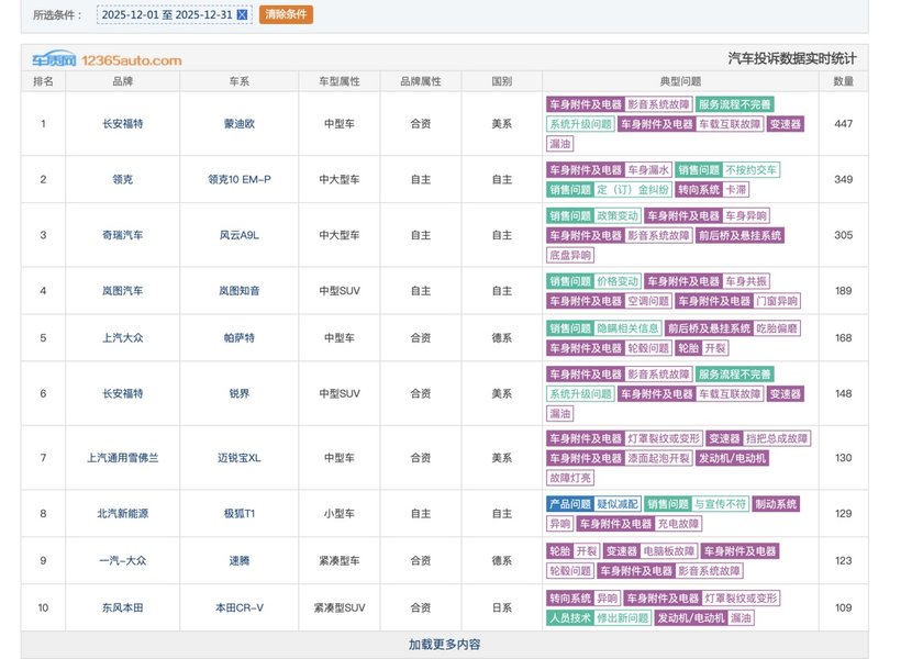 1月初,车质网发布了2025年12月车辆投诉榜单,根据榜单显示长安福特成为榜单中最受争议的品牌——旗下蒙迪欧以447起投诉登顶全品类榜首,锐界以148起投诉跻身第六名,两款车型核心投诉问题高度重合,直指车机系统缺陷,凸显长安福特在智能配置品控与售后应对上的双重短板。