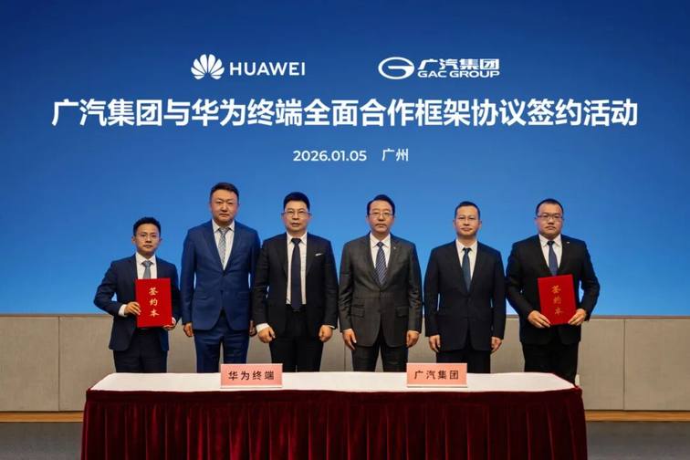 2026年1月5日,华为常务董事、产品投资评审委员会主任、终端BG董事长余承东一行到访广汽集团番禺总部。广汽集团董事长冯兴亚、总经理閤先庆等出席接待。期间,在冯兴亚、閤先庆、余承东以及华为终端云服务总裁朱勇刚的共同见证下,广汽集团平台技术研究院院长梁伟强、华为终端云服务全球生态与销售部总裁宁胜蓝代表双方签署了广汽集团与华为终端全面合作框架协议。