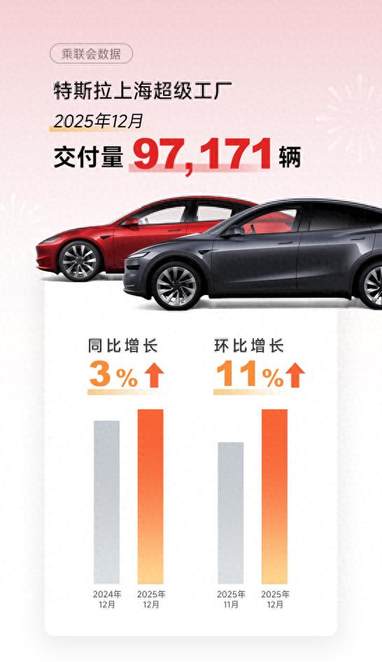 1月5日,据乘联会最新统计数据,特斯拉上海超级工厂在2025年12月交付量超9.71万台,环比增长11%,为2025年最高月份。据媒体估算,12月特斯拉国内销量约9.4万台,同比增长约13%。