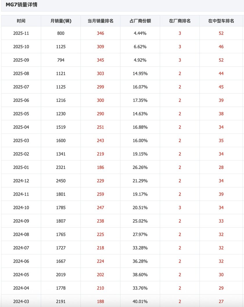 根据公开数据,名爵MG7在2024年的销量呈现两种统计口径,分别为2.54万辆和1.15万辆,但即便取较高值,在竞争白热化的中型车市场中也难言出色。进入2025年,其颓势进一步显现。数据显示,MG7在2025年11月的单月销量已跌至仅800辆,累计年销量也仅有约1.4万至2.1万辆。这一数字,与市场上同价位的热门新能源车型或主流合资燃油车相比,存在巨大差距。