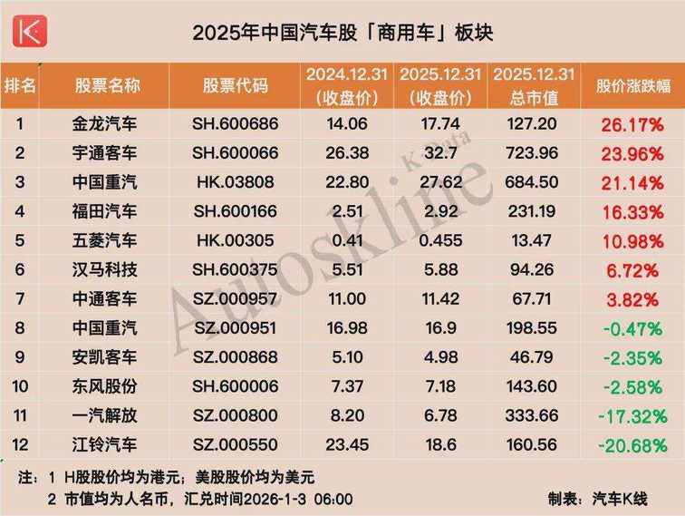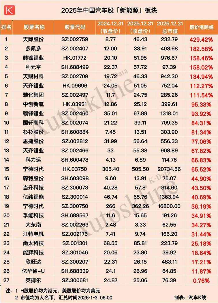 附:汽车股六大板块2025年度走势及涨跌幅前10