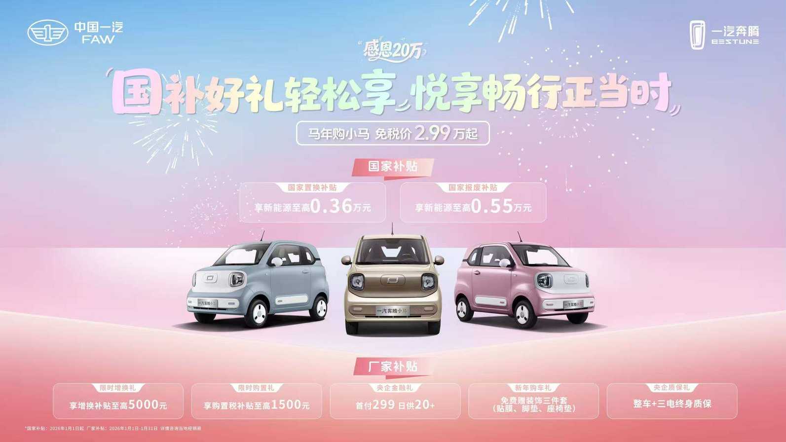 新年伊始,一汽奔腾小马依然能享受国家以旧换新补贴相关政策。同时,为感谢20万份信任,一汽奔腾小马狂撒“感恩20万 国补好礼轻松享 悦享畅行正当时”专属购车福利,即日起购车可享“五重豪礼”:至高5000元无门槛增换购基金、至高1500元购置税补贴、首付299元起的低首付金融方案、免费赠装饰三件套以及整车、三电终身质保,让用户可以闭眼冲。恰逢2026丙午马年,一汽奔腾小马还将带来更时髦的“摩登马”新成员,轻松开启纯电精致生活。