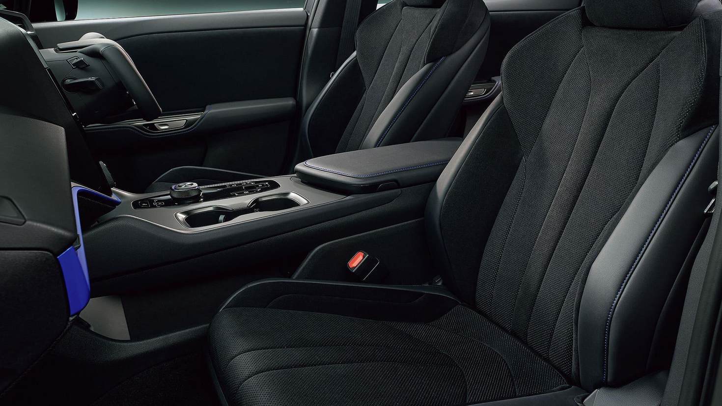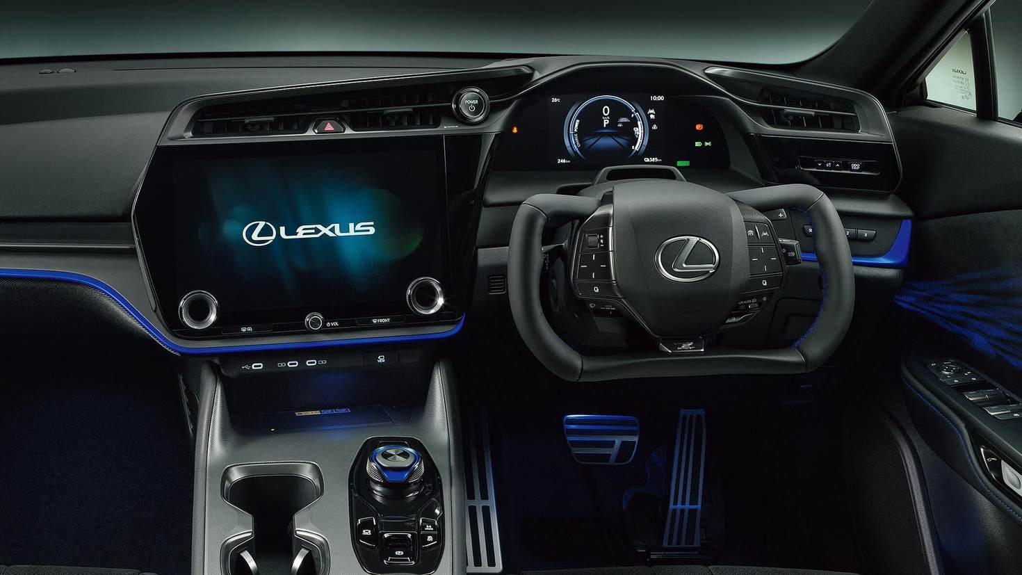 内饰方面,RZ 600e F Sport Performance延续了RZ 550的设计,标配Yoke方向盘与线控转向技术。黑色为主色调的座舱通过蓝色缝线、蓝色氛围灯以及多处仿麂皮材质,营造出鲜明的运动氛围。